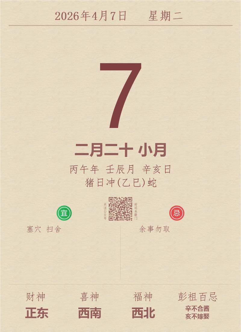 今日老黄历(2026年4月7日):黄历宜忌、财神方位、特吉生肖、打麻将财位