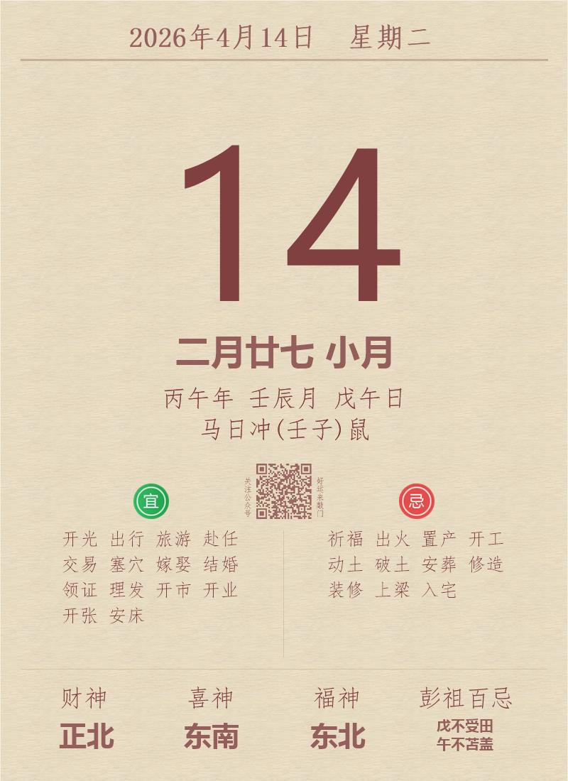 今日老黄历(2026年4月14日):黄历宜忌、财神方位、特吉生肖、打麻将财位