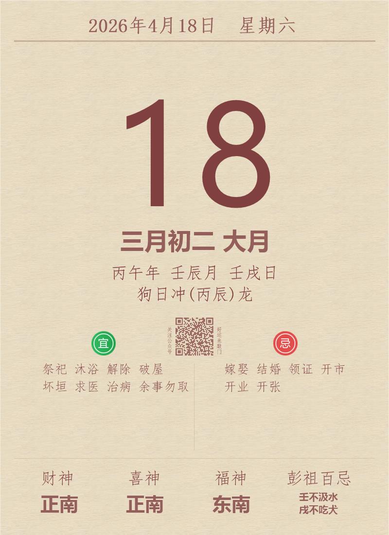 今日老黄历(2026年4月18日):黄历宜忌、财神方位、特吉生肖、打麻将财位