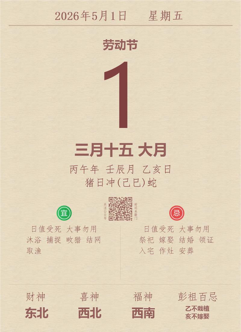 今日老黄历(2026年5月1日):黄历宜忌、财神方位、特吉生肖、打麻将财位